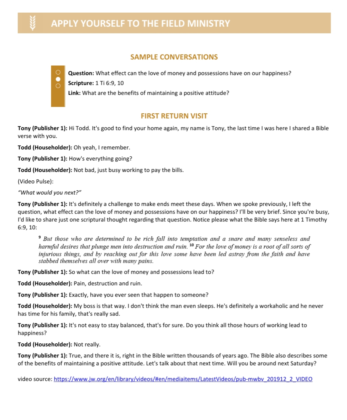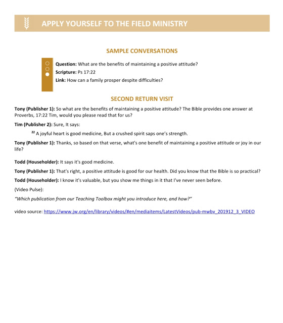 Return Visit Video: (5 min.) Discussion. Play the video, and then ask the audience: How did the publisher demonstrate warmth and empathy? How might the publisher have introduced a publication from the Teaching Toolbox?
