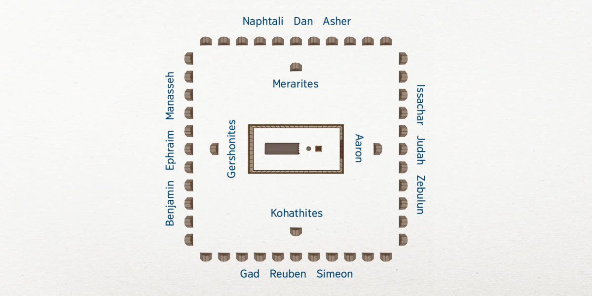 An overhead view of the layout of the camp of Israel. The tabernacle is at the center. Closest to the tabernacle are the families of the tribe of Levi: Aaron to the east, the Kohathites to the south, the Gershonites to the west, and the Merarites to the north. The 12 tribes of Israel are farther away. To the east are Issachar, Judah, and Zebulun. To the south are Gad, Reuben, and Simeon. To the west are Benjamin, Ephraim, and Manasseh. To the north are Naphtali, Dan, and Asher.